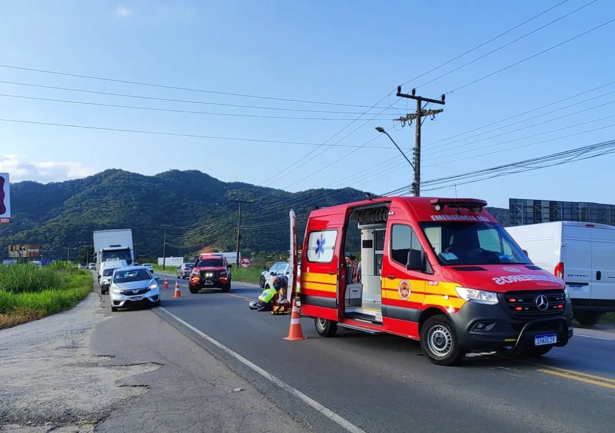Um casal ficou ferido após uma colisão envolvendo uma motocicleta e um carro na tarde desta sexta-feira (17). O acidente foi registrado por volta das 16h22, na rodovia Ivo Silveira, no bairro Bateias, em Gaspar.