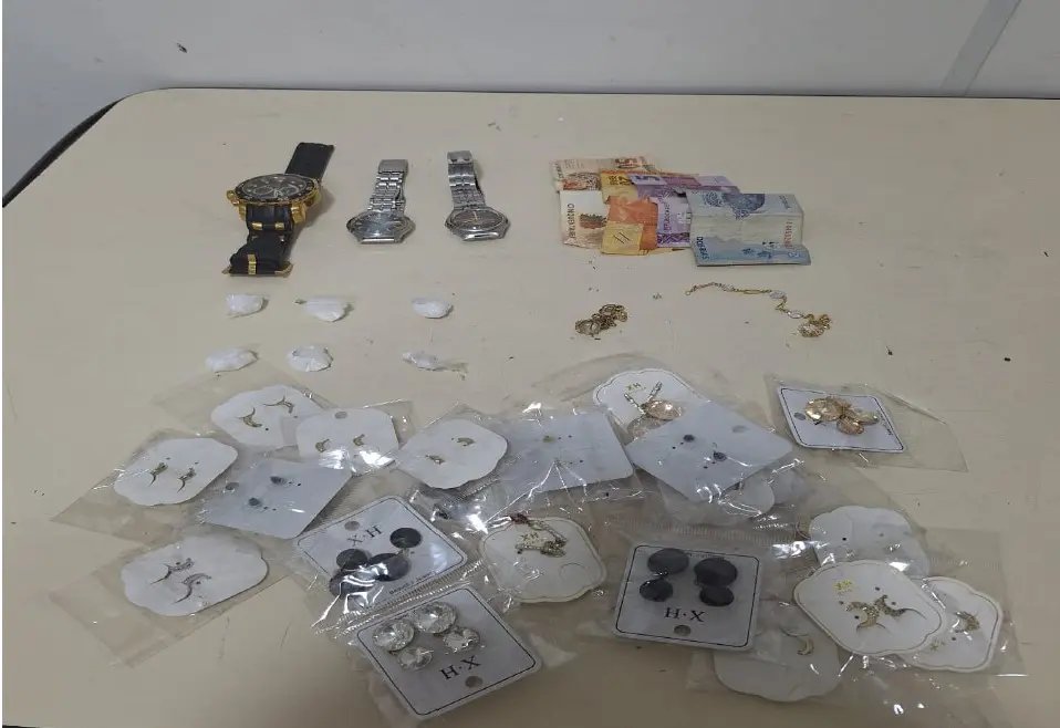 Entre os materiais apreendidos estão seis porções de cocaína, três relógios, um celular e 24 acessórios, como brincos e correntes.
