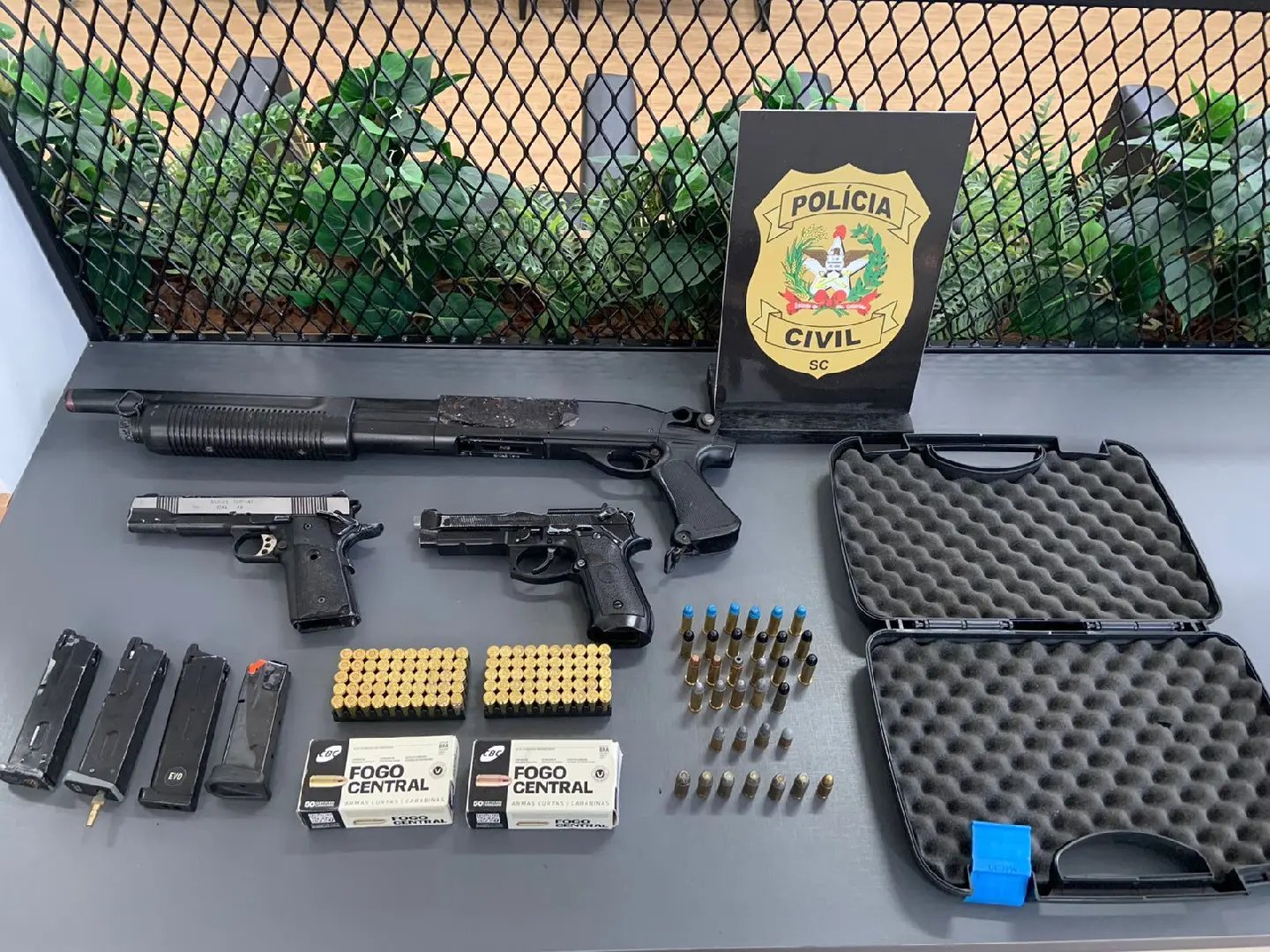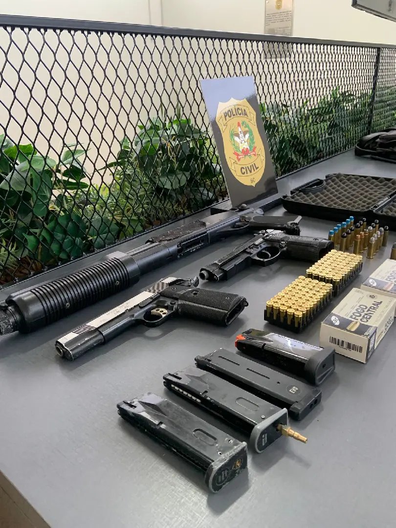 Durante o cumprimento de um dos mandados no bairro Limeira, em Brusque, os policiais localizaram munições de diversos calibres, um carregador de arma de fogo e simulacros de armas, além de aparelhos celulares e outros objetos de interesse para a investigação. Diante do material apreendido, um homem foi preso em flagrante pelo crime de posse ilegal de munição de uso restrito e conduzido à sede da DIC para os procedimentos legais cabíveis.