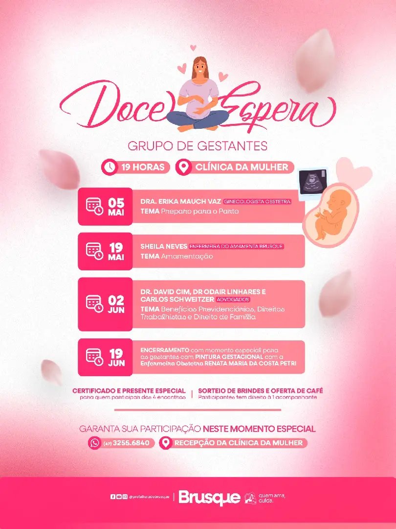 A Secretaria de Saúde de Brusque está com inscrições abertas para uma nova edição do grupo de gestantes Doce Espera, iniciativa voltada ao acolhimento, orientação e troca de experiências entre futuras mães e seus acompanhantes.