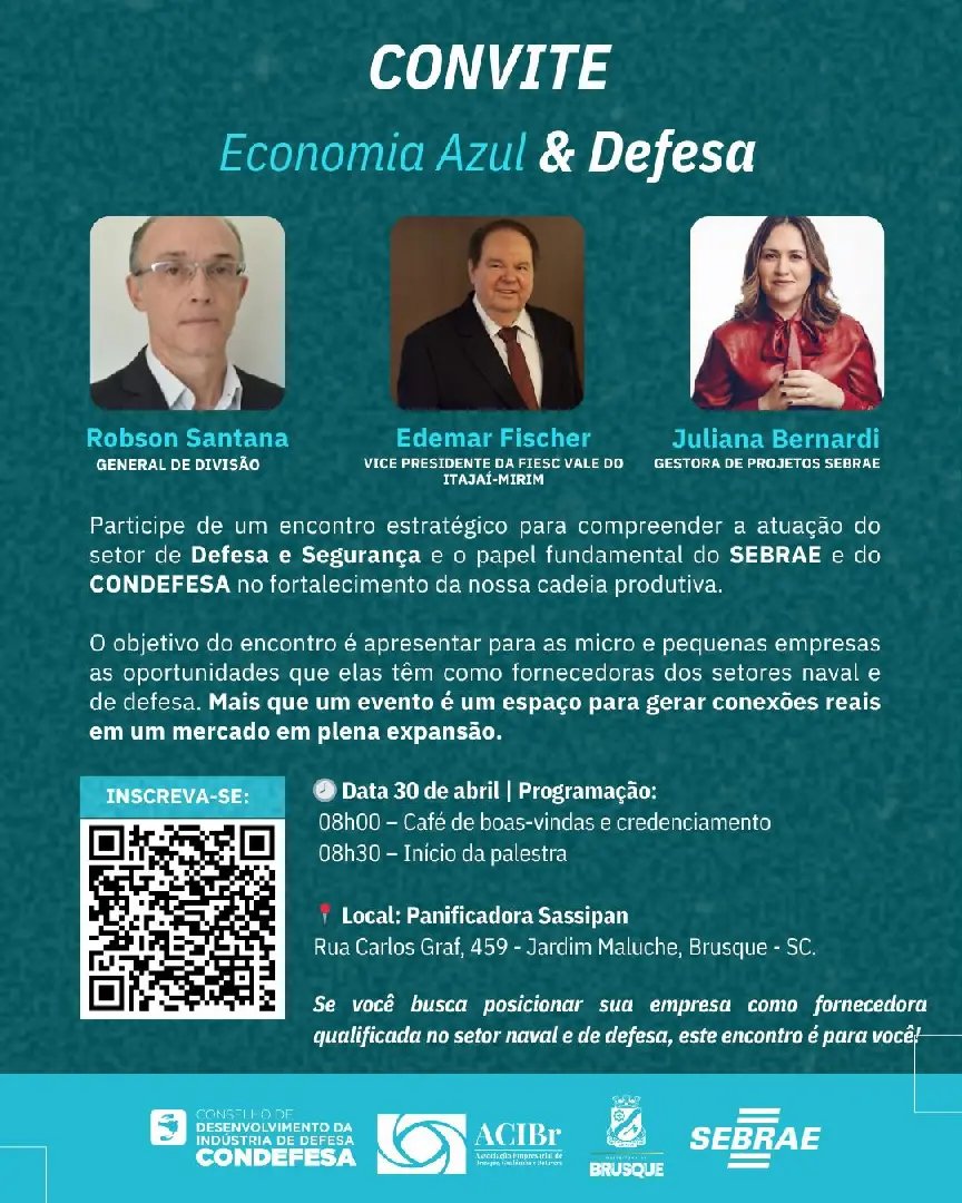 Micro e pequenas empresas de Brusque e região terão uma oportunidade para ampliar horizontes e conhecer novos mercados nesta quinta-feira (30), durante o encontro “Economia Azul e Defesa”, promovido pela Secretaria de Desenvolvimento Econômico e Inovação, em parceria com a ACIBr, Condefesa e o Sebrae.