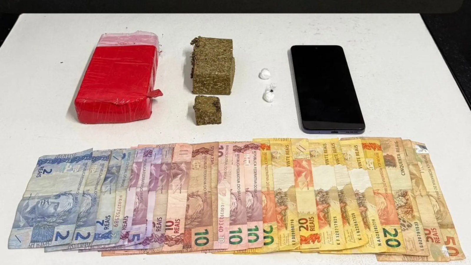 Dentro da sacola, foram encontrados cerca de 500 gramas de substância semelhante à maconha. Em revista pessoal, os policiais localizaram ainda R$ 400 em dinheiro, duas porções de substância análoga à cocaína (aproximadamente 1,5 grama) e um aparelho celular da marca Motorola.