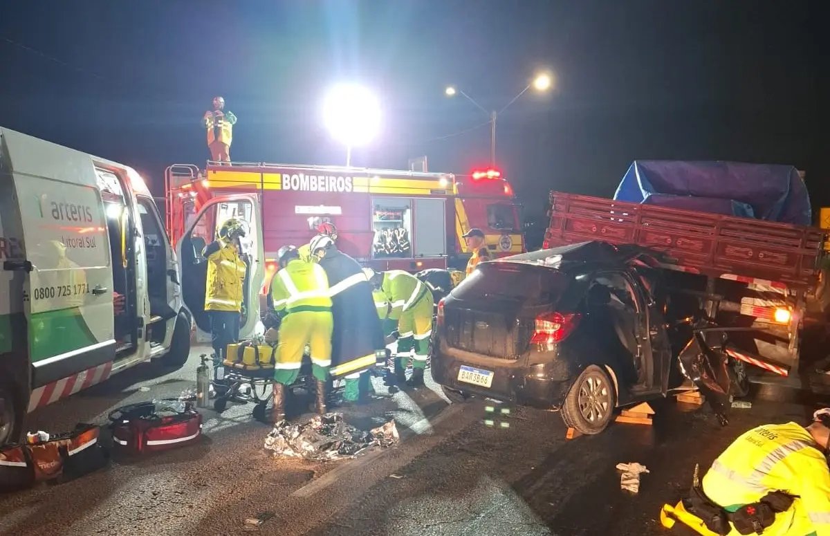 Um motorista ficou preso às ferragens após colidir na traseira de um caminhão na madrugada desta terça-feira (28), por volta das 2h59, na BR-101, sentido Norte, em Porto Belo.