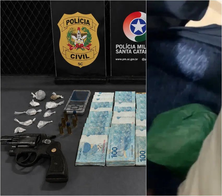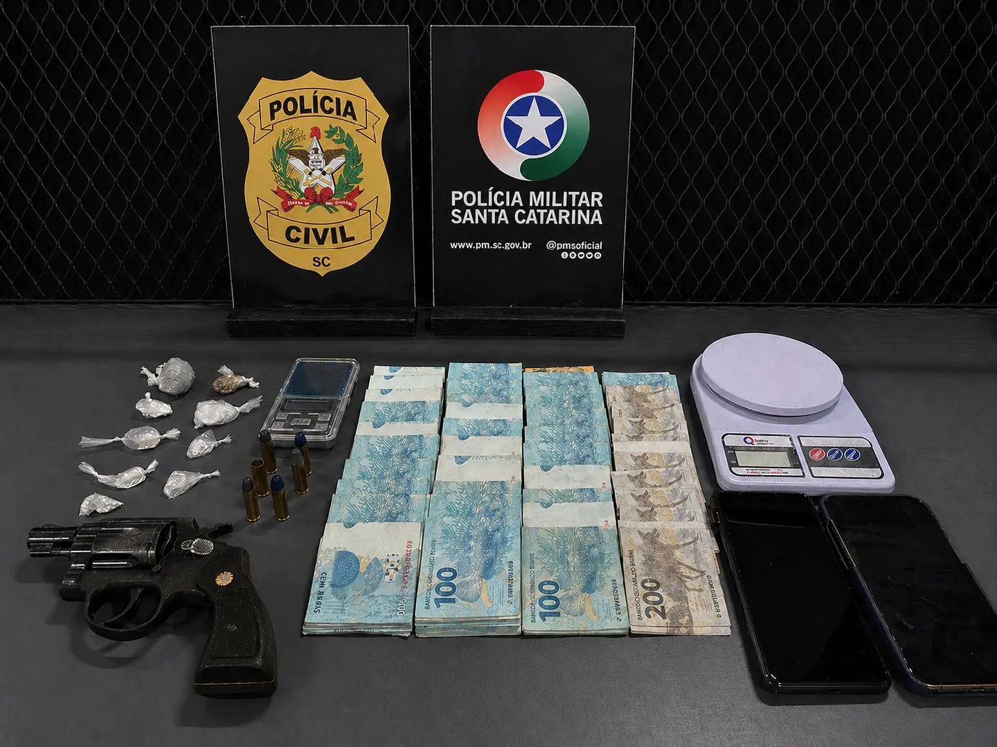 Durante o cumprimento da ordem judicial, os policiais localizaram no imóvel grande quantia em dinheiro em espécie, porções de maconha e cocaína, balanças de precisão, aparelhos celulares e uma arma de fogo municiada. Também foram encontradas porções de cocaína fracionadas e prontas para comercialização em um veículo utilizado pelo investigado.